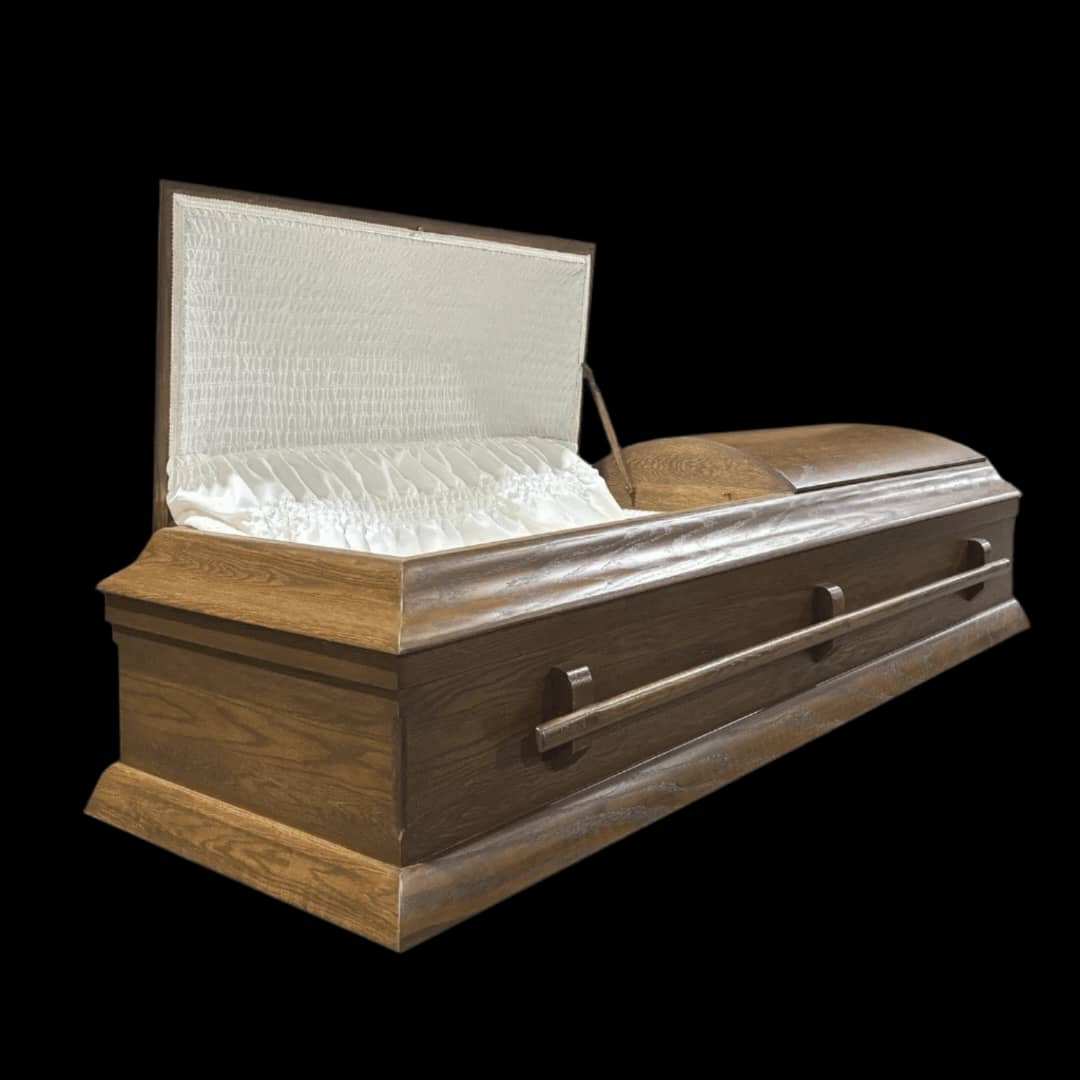 The casket’s hardware — often solid wood handles — complements the oak exterior while maintaining the integrity of the all-wood