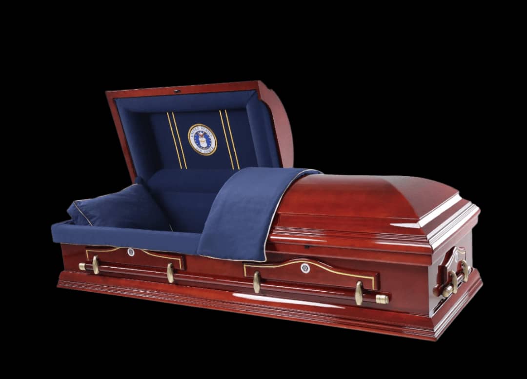 Families typically order this casket through an online funeral goods retailer, select the version that reflects the veteran’s branch of